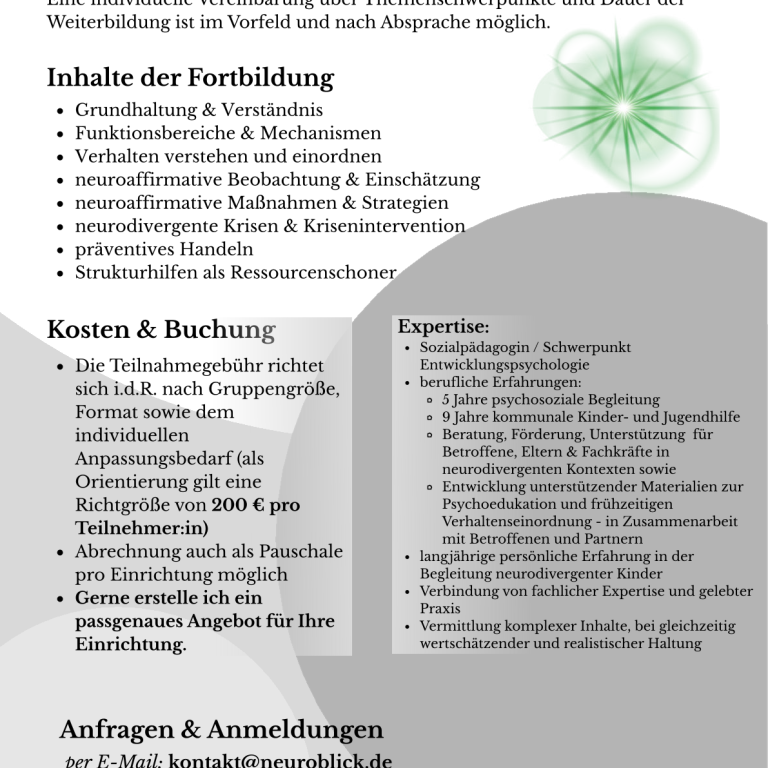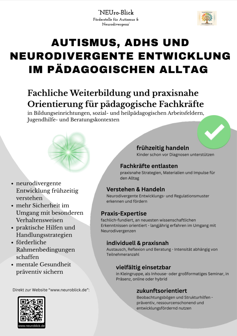 Gemeinsam schauen wir hinter Verhalten, entwickeln ein fachliches Verständnis für Autismus, ADHS und neurodivergente Entwicklungsweisen und ordnen Beobachtungen sicherer ein - mit und auch ohne vorliegende Diagnose.